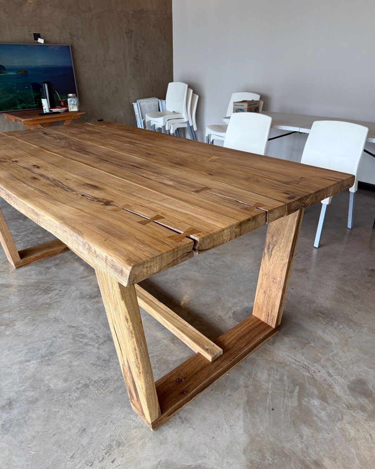 Madera maciza con terminaciones artesanales y un diseño que resalta imperfecciones naturales como parte de su carácter. Su base en forma de marco le da firmeza y una estética contemporánea que invita a compartir momentos.